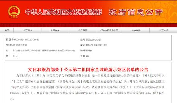 国家文化和旅游部依据《国家全域旅游示范区验收、认定和管理实施办法(试行)》《国家全域旅游示范区验收标准(试行)》,开展了第二批国家全域旅游示范区验收认定工作,并确定了第二批国家全域旅游示范区名单,我省贵阳市乌当区、毕节市百里杜鹃管理区、黔南布依族苗族自治州荔波县、黔东南苗族侗族自治州雷山县等4地入选。11月18日-24日为名单公示时间。