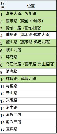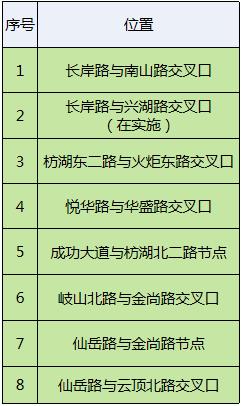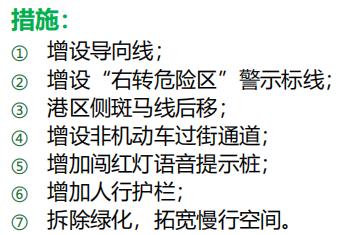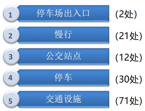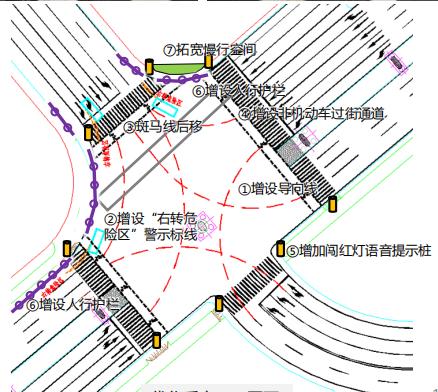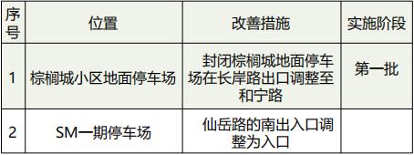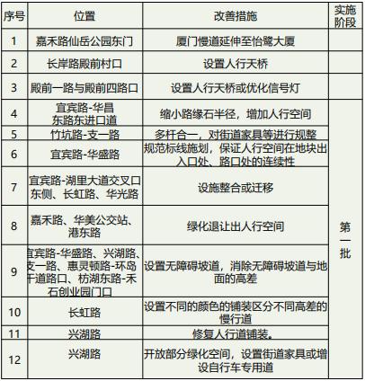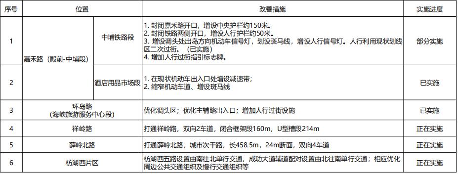 交通设施包括信号灯、中央护栏、标志标线、违停抓拍等,共需改善71项,均第一批实施。例如完善学校周边的标志标线、校门口增设即停即走标志牌等。