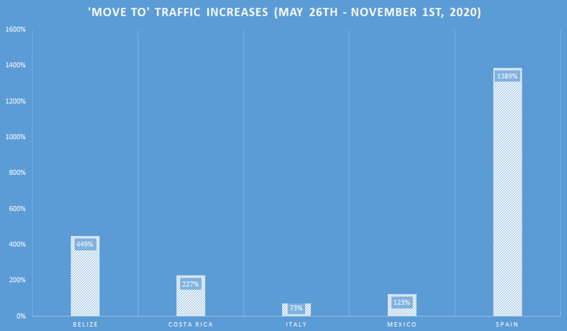 “国际生活 (International Living)”是一家有四十年历史、专注于为美国人提供海外养老信息服务的企业。该公司网站数据显示,从五月份以来,关于“如何搬出美国?(How to Move Out of the U.S.)”的搜索量激增了1676%。“搜索量增长16倍,证明更多的美国人正寻求在国外更好地生活。美国人正在寻求逃离”——该公司如此解读。在这些以“搬出美国”、“如何离开美国”为前缀的搜索中,增长量最大的目标国是西班牙、伯利兹、哥斯达黎加等,甚至墨西哥也在不少美国人的考虑范围内。