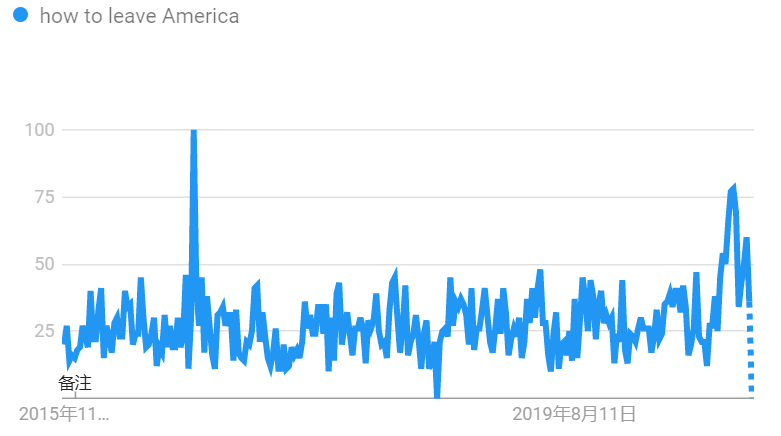 这种不安全感似乎是周期性的,谷歌搜索引擎数据显示,过去五年来,美国人关于“如何离开美国”的搜索量有过两次明显的高峰,都出现在大选前后,一次是2016年11月,一次是今年的10月。