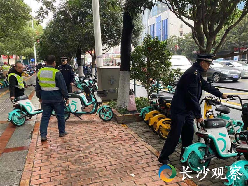 11月25日上午10:00,记者在五一大道建湘路口看到,城管执法人员正督促相关企业的运维人员清理回收无牌共享电单车。