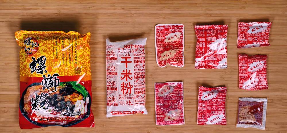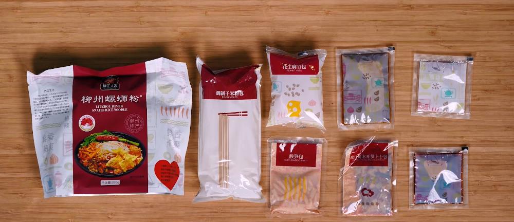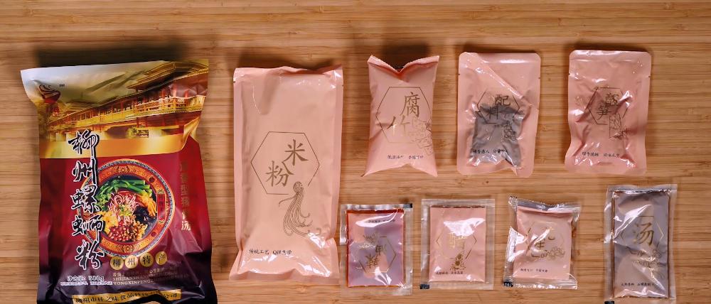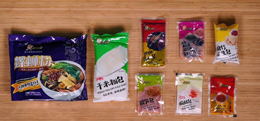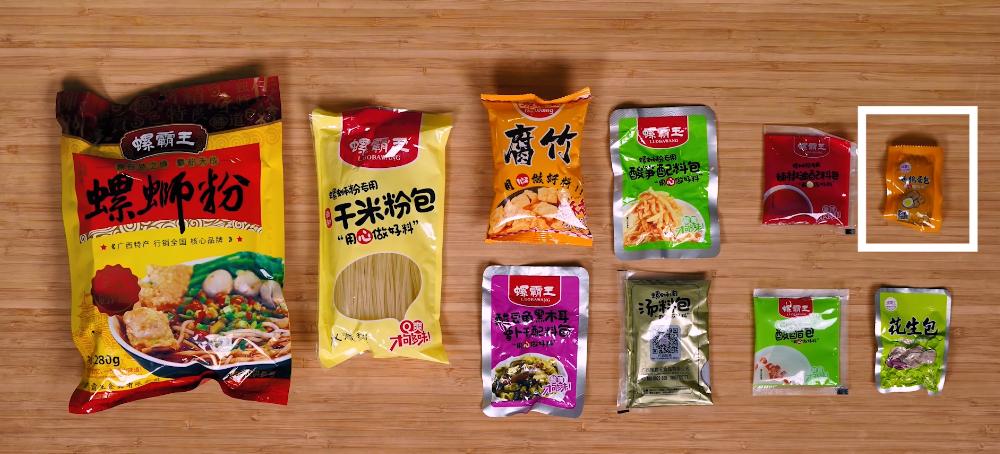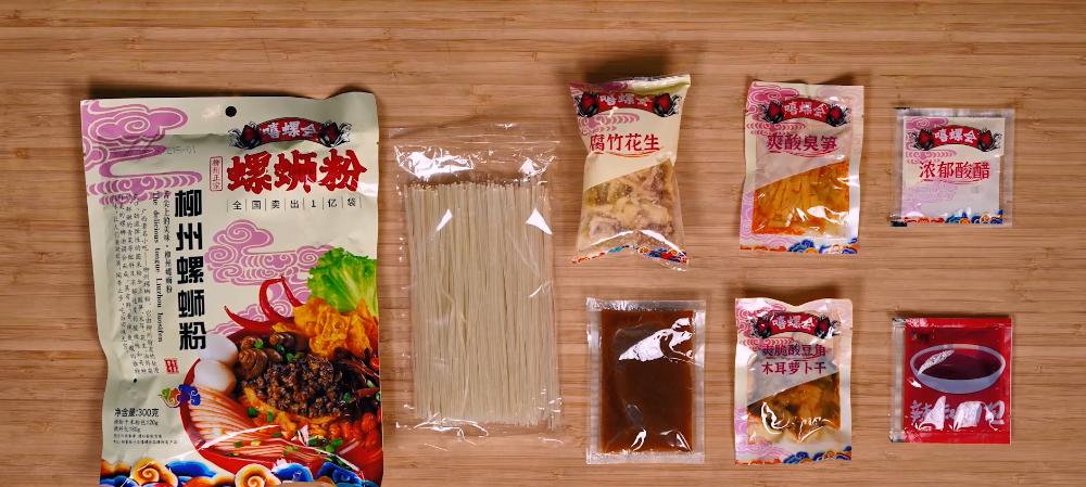一般来说,螺蛳粉的配料大概就有这几种:米粉、酸笋、螺蛳汤料包、小菜包(酸豆角、萝卜干、黑木耳)、腐竹、花生、醋、辣椒油。