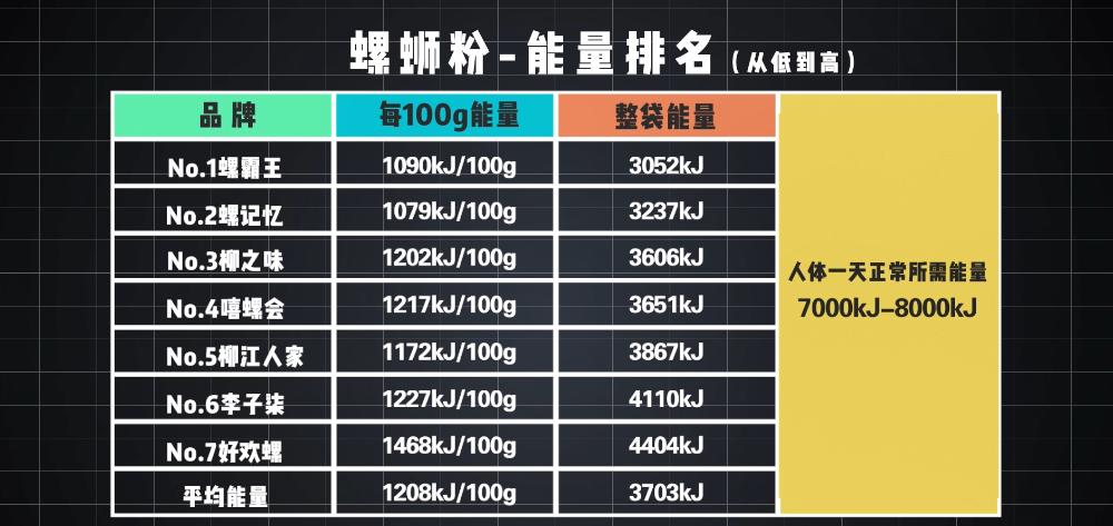 其实只要看一下每款产品配料表里的“能量”这一项就知道了。根据产品的成分表,我们计算出每款螺蛳粉的能量排名。