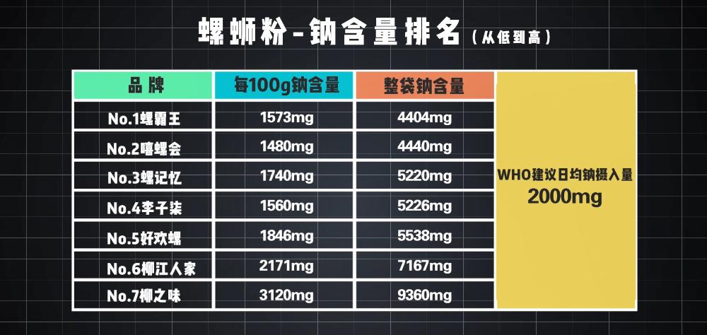 世界卫生组织(WHO)目前推荐的健康成年人钠的摄入量为每日2000mg,相当于每日5g盐。根据产品营养成分表标注的钠含量,7款螺蛳粉的排名是这样的。