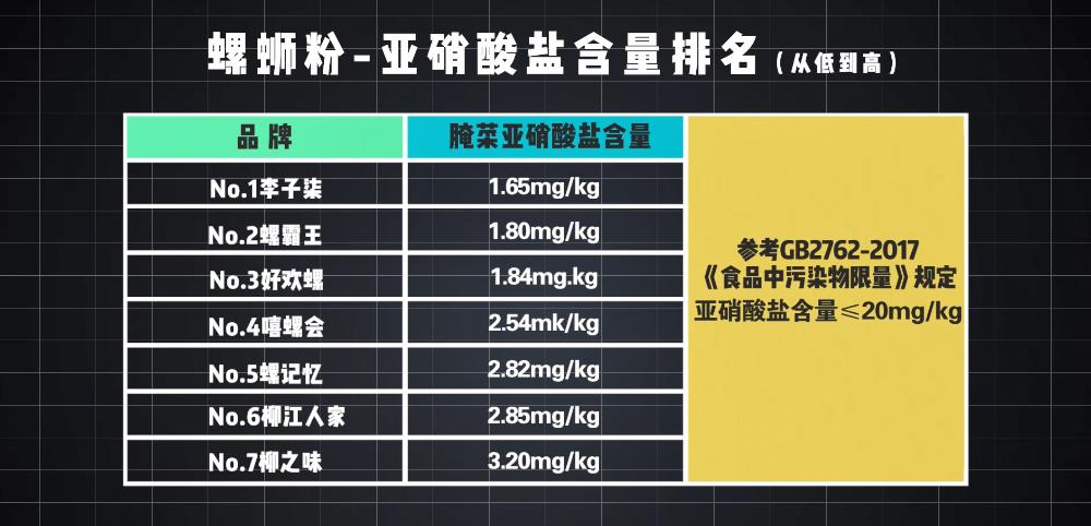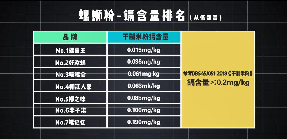 当然这个指标含量越低越好,表现较好的有螺霸王,其镉含量为0.015mg/kg,不足最高限量值的1/10,其次是好欢螺。相反,螺记忆米粉中的镉含量最高,为0.190mg/kg,其次是李子柒,为0.100mg/kg。