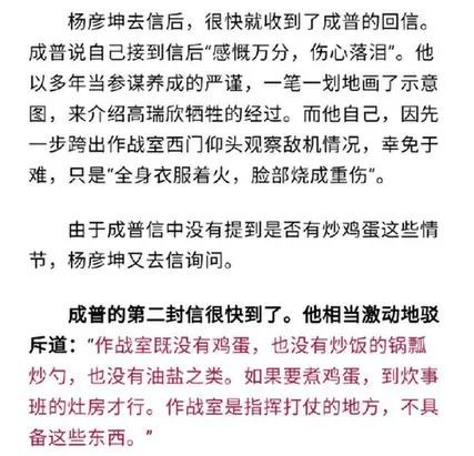 杨某在书中描写“房里有三个人正在用鸡蛋炒米饭”。但事实是在敌机轰炸时,在办公室共有四人,并非三人。