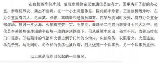 成普同志在《关于毛岸英同志牺牲情况的回忆》中明确写道:在敌机轰炸时,在办公室有毛岸英、成普、高瑞辛和通信员李某四人。