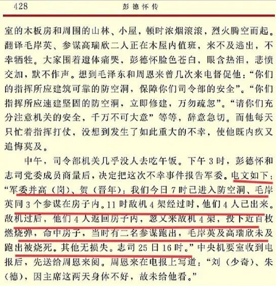 上午十一点左右,四架美军轰炸机嗡嗡略过志愿军总部的上空,向北飞去。毛岸英这会儿也登记,发完了电报,就从箱子里抓起一个苹果吃起来。敌机又从北边飞回来了,投下了近百颗凝固汽油弹,毛岸英,高瑞欣两同志葬身于烈火之中。