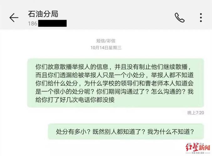 汪文月提供给红星新闻的,其质问教育局石油分局泄露自己举报人身份信息的短信此外,针对汪文月所说的被行政拘留及执法不公等问题,11月27日,红星新闻记者联系上冀中公安局霸西分局长安派出所。一接线民警表示,关于汪文月一事的相关情况他不便透露,但所有的案件他们都是按照法律规定在办理,“这个事的调查情况,建议与分局宣传部门联系。”
