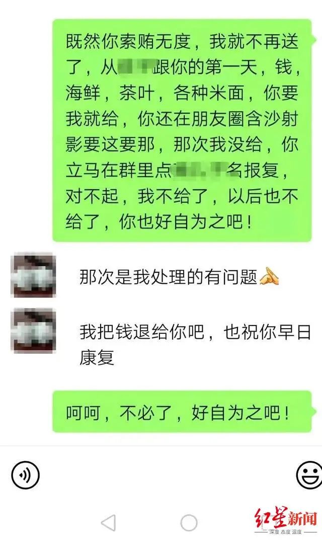 据汪文月提供的对话截图显示,她先是告知曹某“既然你索贿无度,我就不再送了”,后又进一步表示,对方“含沙射影”、隐晦地要这要那时,若她没给,便会被对方在群里点名报复,因此她“不愿再给了”。而对方(曹某)则回复称,“那次是我处理的有问题,我把钱退给你吧。”