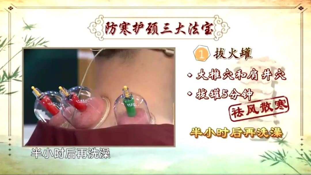 冬季防寒护颈椎,专家推荐在大椎穴和肩井穴(对称)三处拔罐,能起到较好的祛寒作用。