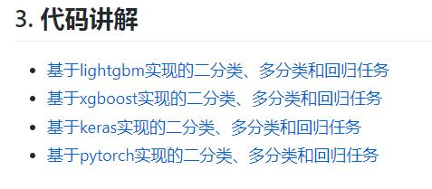 该项目包含二分类模型、多分类模型以及回归模型,它们分别基于 lightgbm 实现、xgboost 实现、keras 实现和 pytorch 实现: