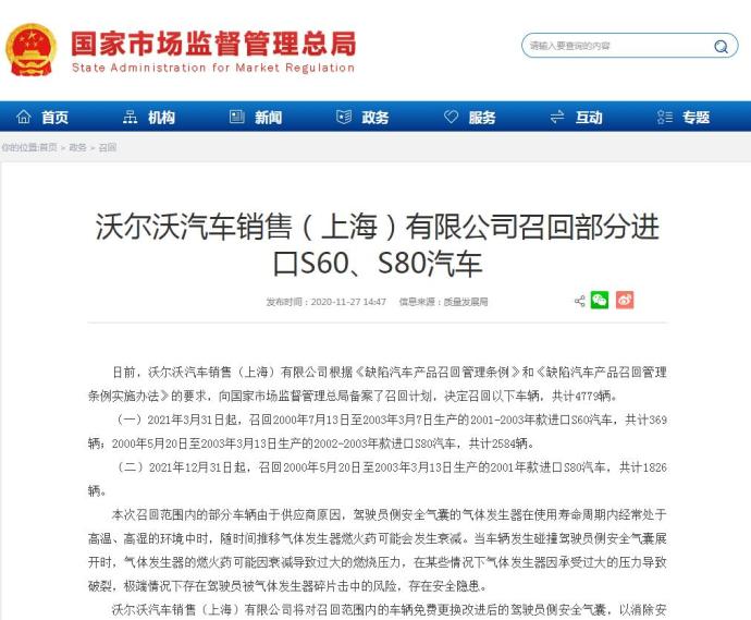 日前,沃尔沃汽车销售(上海)有限公司根据《缺陷汽车产品召回管理条例》和《缺陷汽车产品召回管理条例实施办法》的要求,向国家市场监督管理总局备案了召回计划,决定召回以下车辆,共计4779辆。(一)2021年3月31日起,召回2000年7月13日至2003年3月7日生产的2001-2003年款进口S60汽车,共计369辆;2000年5月20日至2003年3月13日生产的2002-2003年款进口S80汽车,共计2584辆。