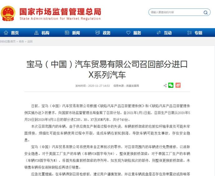 日前,宝马(中国)汽车贸易有限公司根据《缺陷汽车产品召回管理条例》和《缺陷汽车产品召回管理条例实施办法》的要求,向国家市场监督管理总局备案了召回计划。自2021年1月1日起,召回生产日期从2020年5月29日到2020年9月11日的部分进口X5、X6、X7及X5M汽车,共计740台。
