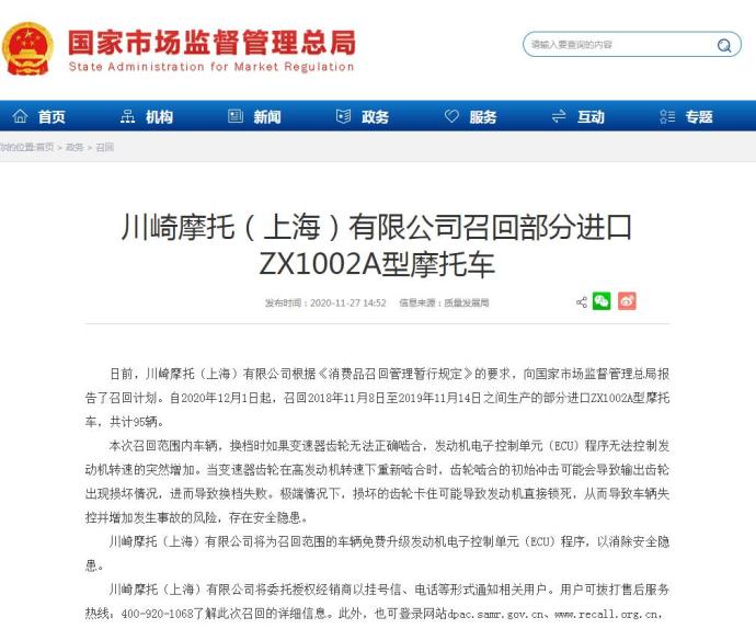 日前,川崎摩托(上海)有限公司根据《消费品召回管理暂行规定》的要求,向国家市场监督管理总局报告了召回计划。自2020年12月1日起,召回2018年11月8日至2019年11月14日之间生产的部分进口ZX1002A型摩托车,共计95辆。