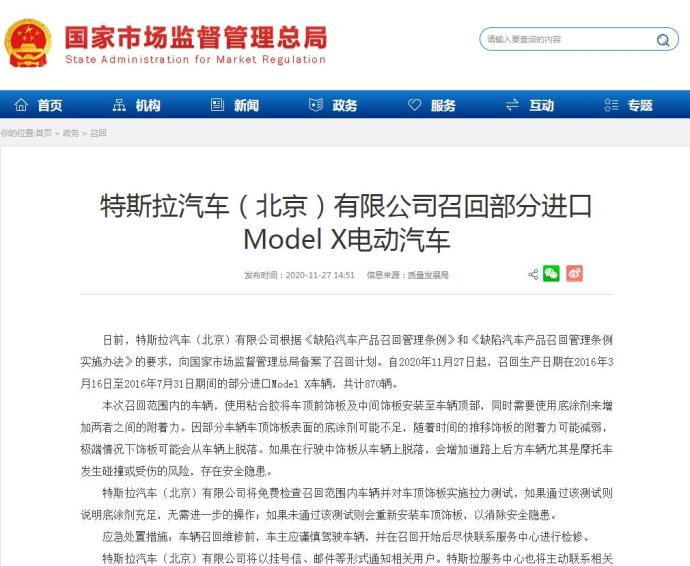 日前,特斯拉汽车(北京)有限公司根据《缺陷汽车产品召回管理条例》和《缺陷汽车产品召回管理条例实施办法》的要求,向国家市场监督管理总局备案了召回计划。自2020年11月27日起,召回生产日期在2016年3月16日至2016年7月31日期间的部分进口Model X车辆,共计870辆。