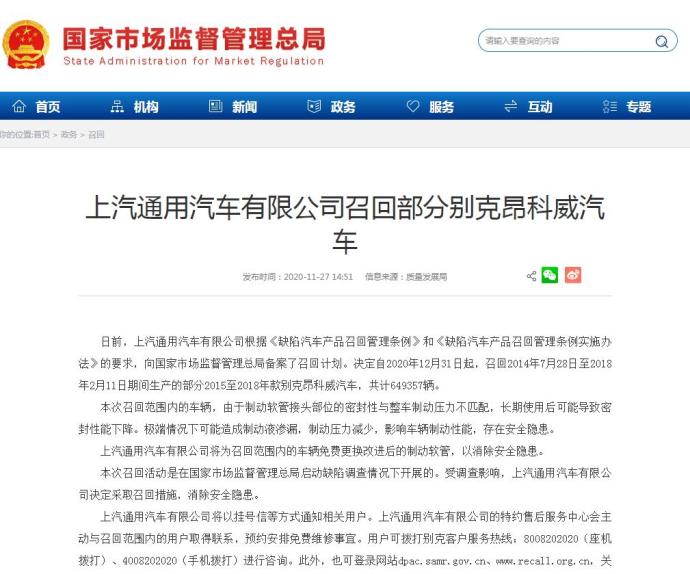 日前,上汽通用汽车有限公司根据《缺陷汽车产品召回管理条例》和《缺陷汽车产品召回管理条例实施办法》的要求,向国家市场监督管理总局备案了召回计划。决定自2020年12月31日起,召回2014年7月28日至2018年2月11日期间生产的部分2015至2018年款别克昂科威汽车,共计649357辆。
