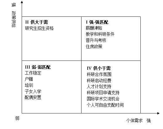 工作稳定、户籍、培训、子女入学、配偶安置等5项内容的政策供给与个体需求相互为弱-弱匹配关系。这些内容校际之间差异小,确定性高,“议价”空间窄,属于学校和个人之间不谈也有、谈也基本不会改变的内容。因此,也可以说这些个体需求不仅是个体所实际需要的,更是对政策的诉求。