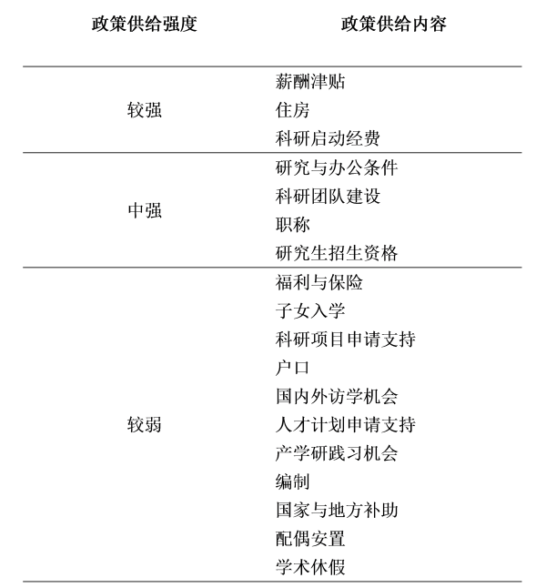 从上表可见,属于较强供给的政策要点包括薪酬津贴、住房、科研启动经费;属于中等强度供给的政策要点包括研究与办公条件、科研团队建设、职称、研究生招生资格;属于较弱供给的政策要点包括福利与保险、子女入学、科研项目申请支持、户口、国内外访学机会、人才计划申请支持、产学研践习机会、人事编制、国家与地方补助、配偶安置、学术休假等11项。