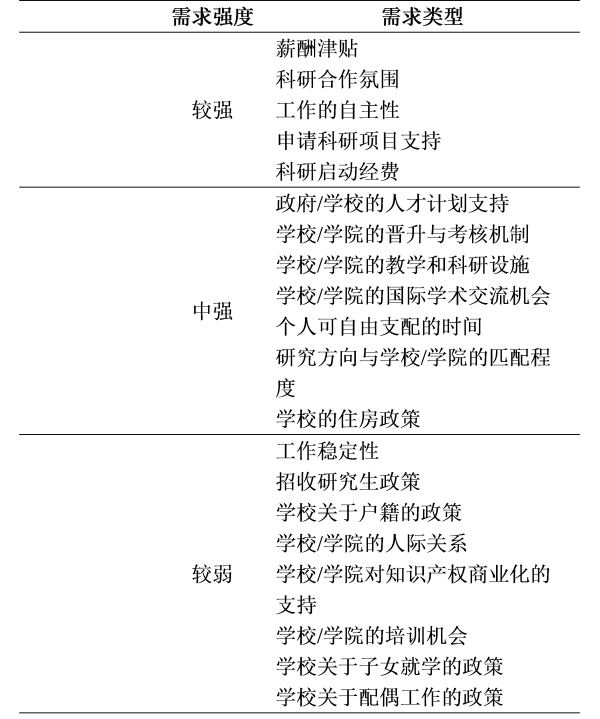 强度排序靠前的个体需求中,与科研相关的占了较大比重,如科研合作氛围、科研项目申请制度、科研启动经费、教学与科研设施等均位列前十。强度排序靠后的个体需求是与家庭相关的,包括子女就学、配偶工作的政策安排。较强需求有5项,包括薪酬津贴、科研合作氛围、工作自主性、申请科研项目支持、科研启动经费;中等强度需求有7项,包括是否有人才计划支持、晋升与考核机制、教学与科研设施、国际学术交流机会、个人可自由支配时间、研究方向匹配程度、学校住房政策;较弱需求有8项,包括工作稳定性、研究生招生政策、落户政策等。