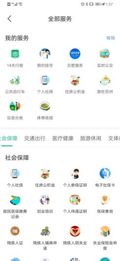 “置顶服务”中,主要包括优选省政务服务一网通办办事指南、12345便民热线、苏康码、iSuzhou等。“社会保障”方面,主要包括个人社保、住房公积金、个人参保证明、电子社保卡、居民医保缴费记录、创业培训、个人待遇证明、低保查询、残疾人证、残疾人辅具申请、残疾人就失业、失业保险金申报、失业登记申报、申报就业查询、就业困难人员申报、个人《就业创业证》、儿童福利机构等。