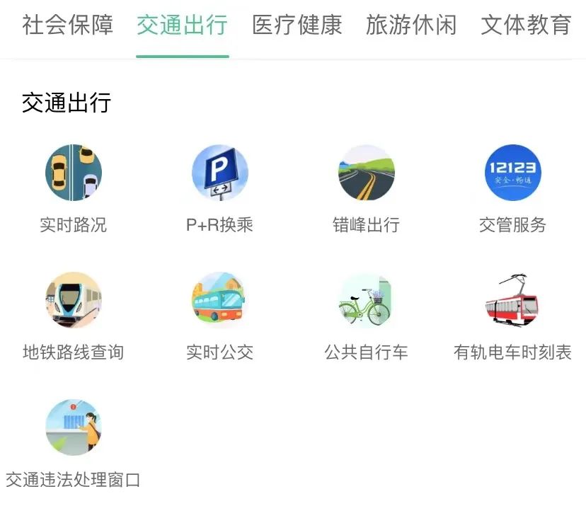 “交通出行”服务则可以查询实时路况、P+R换乘、错峰出行、交管服务、地铁路线查询、实时公交、公共自行车、有轨电车时刻表、交通违法处理窗口等。