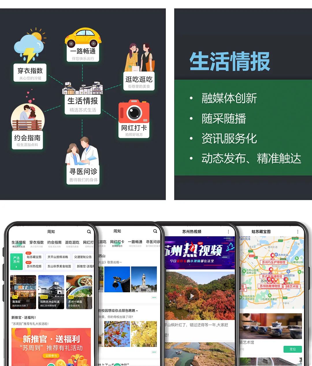 “苏州热视频”里有当日最火、最有趣的短视频,“姑苏藏宝图”里则藏着“百馆之城”的“宝贝们”,还有随采随播的“一句话”、“一张图”、“一个小视频”,真正实现动态发布、智能推送、精准触达。“社交分享”