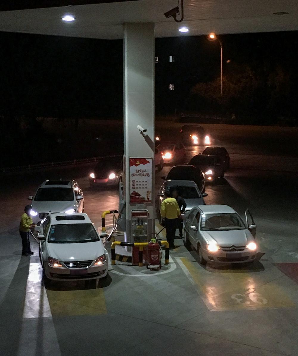 韩哥走后,只剩我一个人留在加油机旁。我反复穿梭于加油岛左右,两侧的车辆如水流一般涌来。小站这个时候早就无人问津了,可在大站,直到晚上九点半,我都忙着加油,甚至还没来得及吃晚饭。