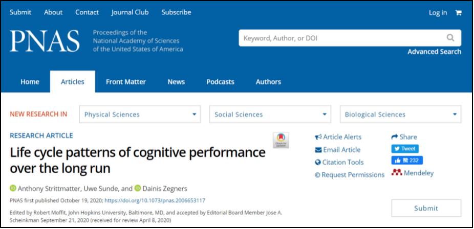 2020年10月19日德国慕尼黑大学等机构研究人员在《美国国家科学院院刊(PNAS)》上发表的一项《Life cycle patterns of cognitive performance over the long run》研究中指出: