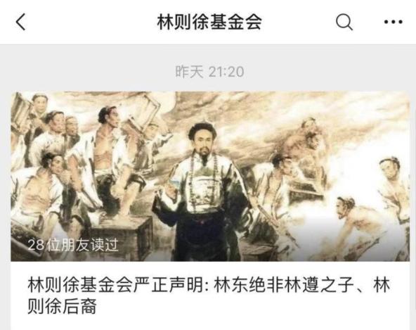 11月29日晚,林则徐基金会微信公众号发布声明表示,很多关心此事的社会人士纷纷向林则徐基金会求证林东是否林遵之子、林则徐后裔。林则徐基金会副会长、林则徐六代孙女林祝光当即与林遵大女儿林华卿联系,林华卿女士对此表示否认。