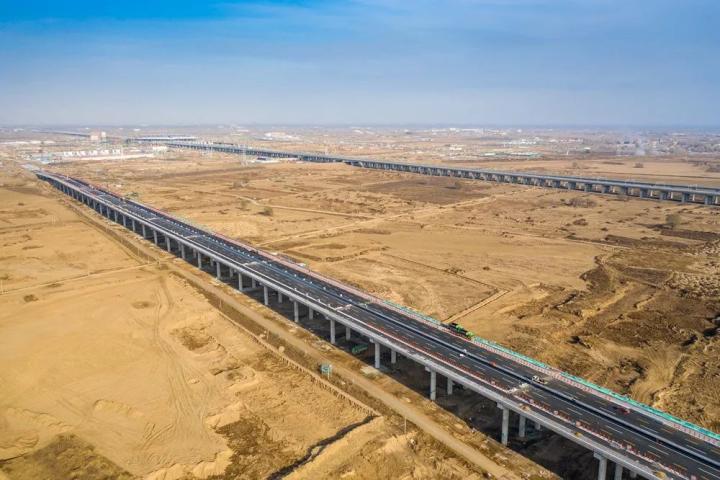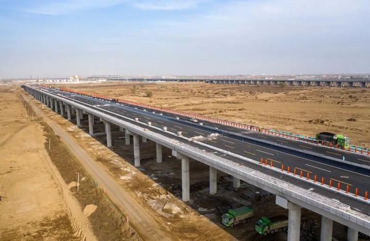 作为雄安高铁站重要交通联络通道的雄安站西侧干路工程,分为桥梁工程和道路工程两部分。桥梁工程为新盖房特大桥,是雄安新区首座特大桥,跨越新盖房分洪道,全长约2.2千米,标准桥面宽度40米,桥面面积8.89万平方米,全桥共51跨。