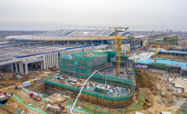 从规划上看,雄安站站体配套综合商业项目共五层结构,其中地上三层、地下两层,包含有商业店铺、超市、餐厅、车库,地上二层有连廊可直接连通到雄安站站房,建筑外立面以玻璃幕墙和石材幕墙为主,风格上与雄安站保持一致。“由于雄安站站房的抗震设防烈度超过8度,配套项目的抗震设防烈度也是相同的标准。”付勇攀说,主体结构施工中,项目团队特别在结构外侧加了一圈“防护墙”。而为了提高施工效率,每个建筑单体都被划分为10个流水段,平行施工。