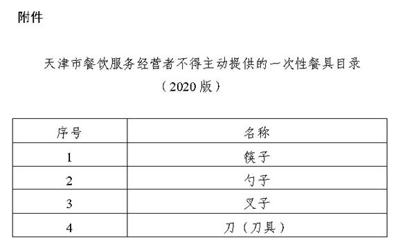 11月30日,天津市市场监管委发布《关于贯彻落实有关工作的通知》。其中提到,餐饮经营者……不得主动向消费者提供一次性餐具。包括一次性的筷子、勺子、叉子、刀(刀具)四类。