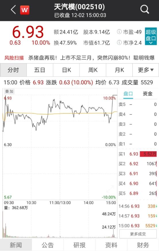 12月2日,天汽模尾盘涨停,收于6.93元/股,截至收盘,仍有5.5万手牢牢封死涨停,成交额达24亿元。这也是该股连续5日封板,目前总市值已突破60亿元。
