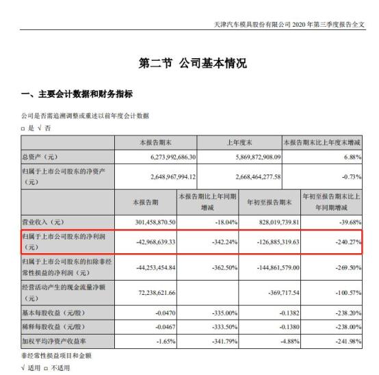 天汽模10月31日最新公布的2020年三季报显示,前三季度营业收入8.28亿元,同比下降39.68%;归属于上市公司股东的净利润-1.27亿元,同比下降240.27%。基本每股收益-0.1382元。公司在此前的第三季度业绩预告中表示,本报告期内,受疫情影响,公司模具销售规模大幅下降,导致公司营业收入和毛利率下降明显。