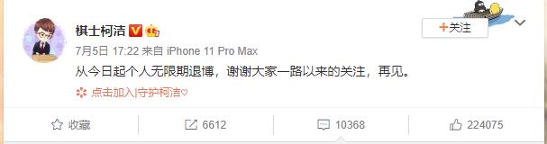 柯洁是今年7月5日宣布“无限期退博”的,当时有网友调侃,无限期的意思就是一星期,因为这个热衷于在微博上分享生活,发表观点并跟网友争执的年轻人,之前经常说要远离微博一星期,但很快又忍不住发微博。