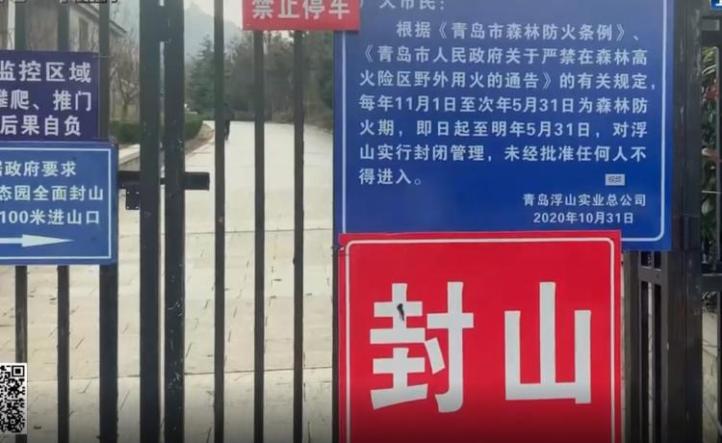 在封闭的大门上发出的公告显示,封山是根据《青岛市森林防火条例》、《青岛市人民政府关于严禁在森林高火险区野外用火的通告》的有关规定,每年11月1日至次年5月31日为森林防火期,对浮山实行封闭管理,未经批准任何人不得进入。