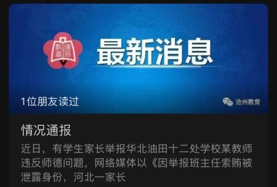 以下为全文:近日,有学生家长举报华北油田十二处学校某教师违反师德问题,网络媒体以《因举报班主任索贿被泄露身份,河北一家长遭其他家长声讨并被浇了一盆热水,后因找家长“理论”被行拘20天》为题登载。沧州市教育局核查组赴位于霸州市的华北油田十二处学校对有关问题进行了核查。