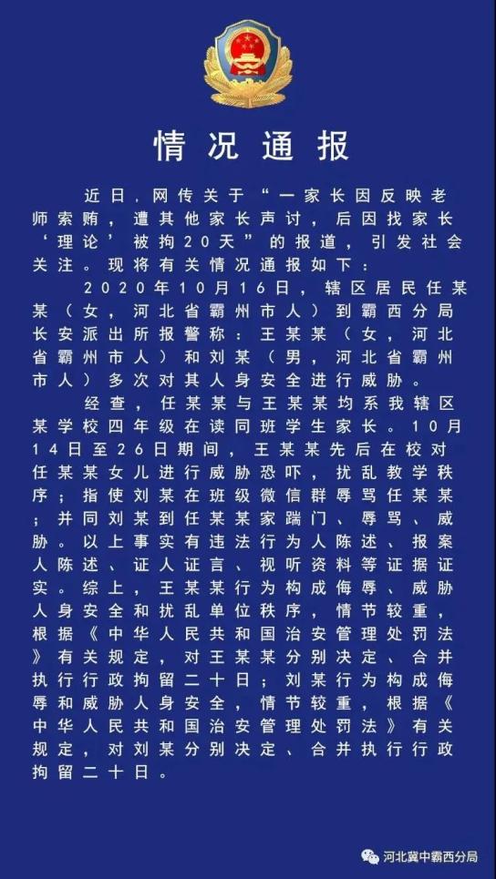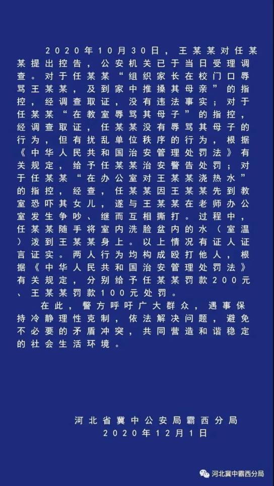 12月1日,河北省冀中公安局霸西分局曾发布情况通报称,王某某与任某某系同班学生家长,10月14日至26日期间,王某某先后在校对任某某女儿进行威胁恐吓,扰乱教学秩序;指使刘某在班级微信群辱骂任某某;并同刘某到任某某家踹门、辱骂、威胁,王某某行为构成侮辱威胁人身安全和扰乱单位秩序,情节较重,根据《中华人民共和国治安管理处罚法》有关规定,对王某某分别决定合并执行行政拘留二十日。