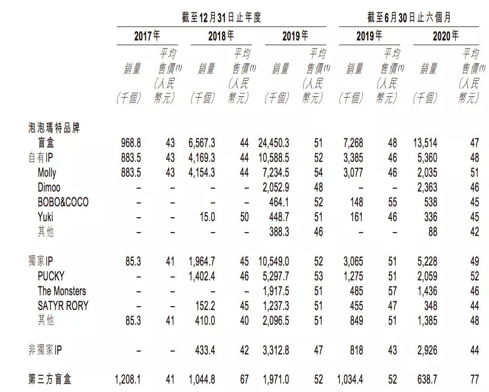2017-2019三个年度以及截至2019年及2020年6月30日止六个月,泡泡玛特的盲盒产品销售产生的收益分别为9140万、3.596亿、13.592亿、4.024亿和6.887亿元,分别占同期泡泡玛特总收益的57.8%、69.9%、80.7%、74.0%及84.2%。