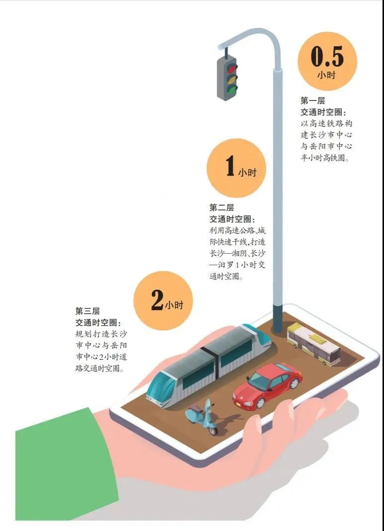 第三层则是规划打造长沙市中心与岳阳市中心2小时道路交通时空圈。