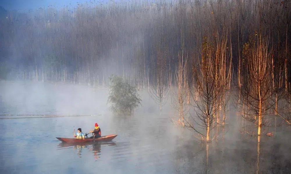 沂源虽不似青州古色古香,却也别有一番风味。冬日的沂源天湖天高云淡,风儿轻扬,湖上的晚霞、远处的云、连同湖面上的人共同构成一幅和谐的画卷。
