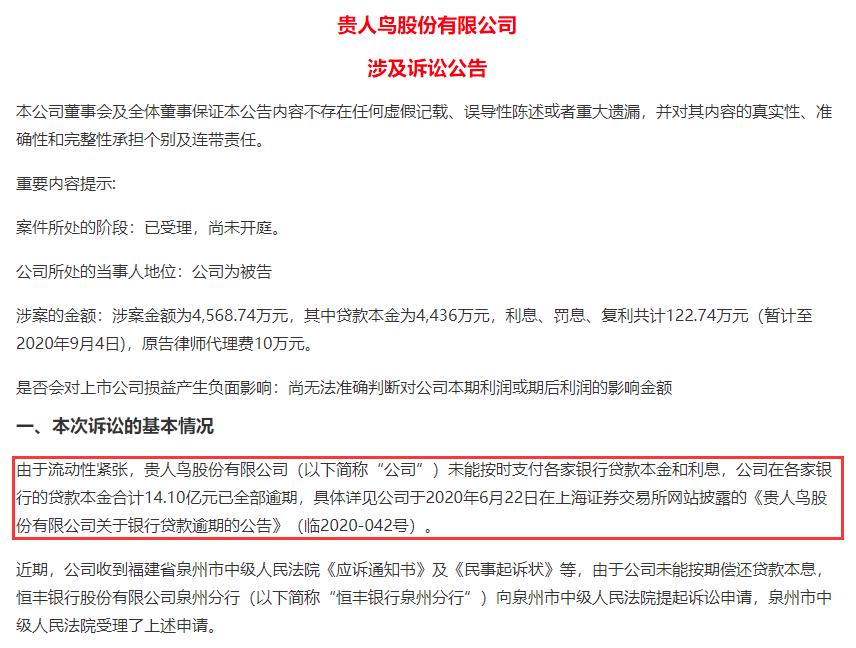 12月2日,贵人鸟股份有限公司发布的涉及诉讼公告中提及,由于流动性紧张,该公司未能按时支付各家银行贷款本金和利息,公司在各家银行的贷款本金合计14.1亿元已全部逾期。
