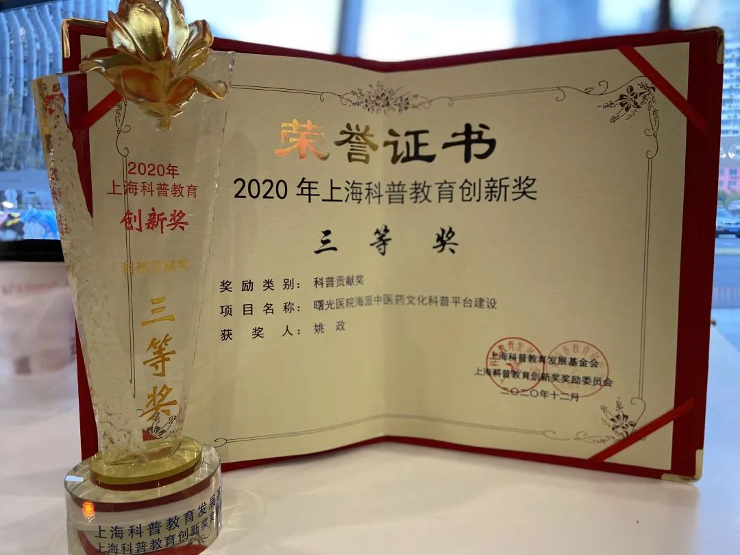 12月4日,2020年度上海科普教育创新奖颁奖典礼在儿艺剧院举行。上海中医药大学附属曙光医院党委副书记姚政领衔的“海派中医药文化科普平台建设”项目获得2020年度上海科普教育创新奖——科普贡献奖(个人)三等奖。