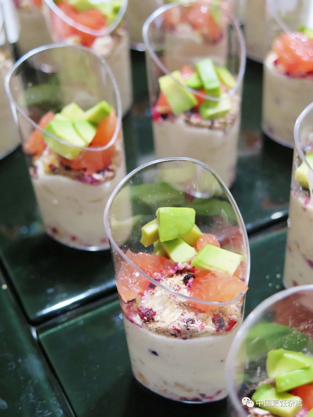 葡萄柚酒味慕斯燕麦杯葡萄柚酒味慕斯燕麦杯清香柔软,是亚洲人喜欢的淡甜果香。据周卫介绍,他采用了芬兰的两款燕麦产品,底层用了红莓燕麦,中间夹了一层慕斯,最上面放了蓝莓燕麦和西柚、牛油果等果粒,还加入了一点蓝莓利口酒,口感层次丰富。