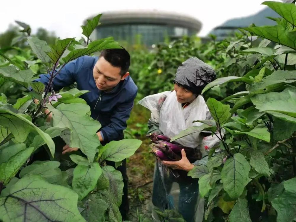 余永流(左)在田间帮助群众采收茄子