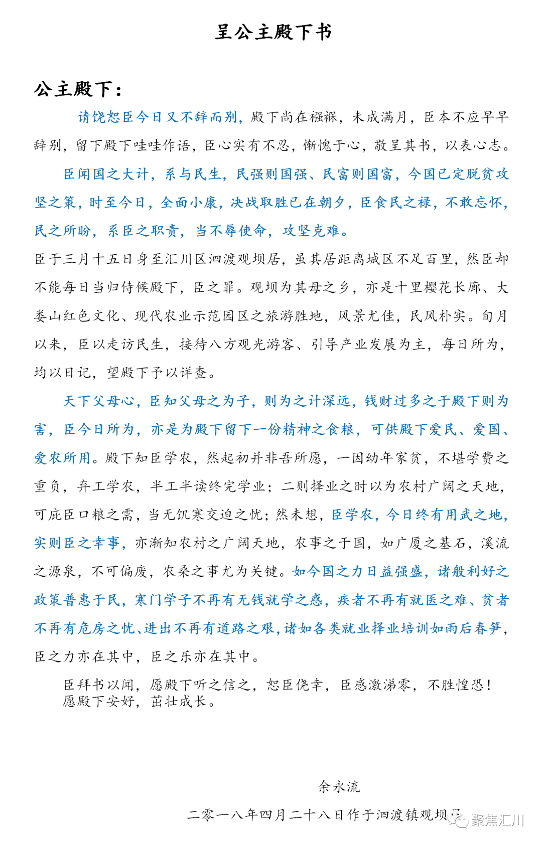 这里提到的“公主”指的是余永流的女儿,这个称呼来自于余永流生前给女儿的一封信。澎湃新闻记者查询发现,微信公众号“聚焦汇川”12月3日公布了这封信的全文。这封只有683字的文言文式家书,是汇川区泗渡镇观坝社区已逝驻村干部余永流,在2018年4月28日写给出生仅21天的女儿的一封信。