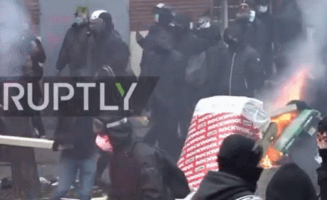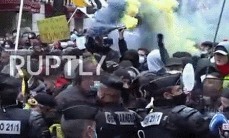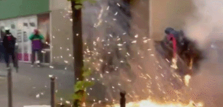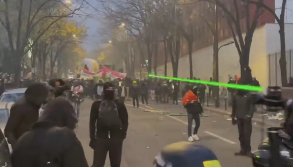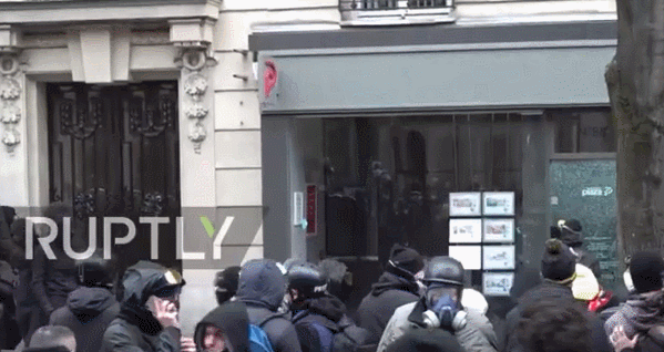 和平游行随后陷入混乱,一群群身穿黑衣、蒙着脸的示威者,开始打砸门店橱窗玻璃、焚烧汽车。巴黎东部街道陷发生暴力冲突,示威者竖起路障、纵火焚烧、使用激光笔乱射,与警方对峙,现场能听到类似爆炸的声音。