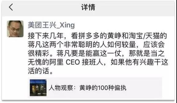 而王兴的评论,则根本就忽略了刘强东,把未来几年,看作是黄峥和蒋凡两人之间的竞争。