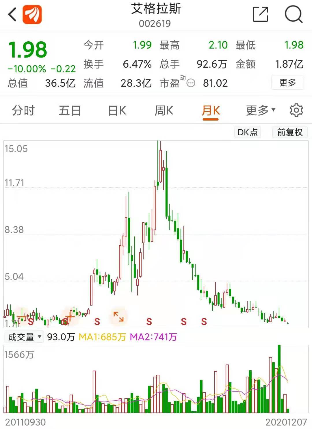 或是受此公告影响,艾格拉斯12月7日复牌后(此前因筹划控制权变更自11月30日开市起停牌)以9.55%大幅低开,开盘后先向上反弹,跌幅一度收窄至5%左右,此后一路走低,尾盘封死跌停,股价报收1.98元。